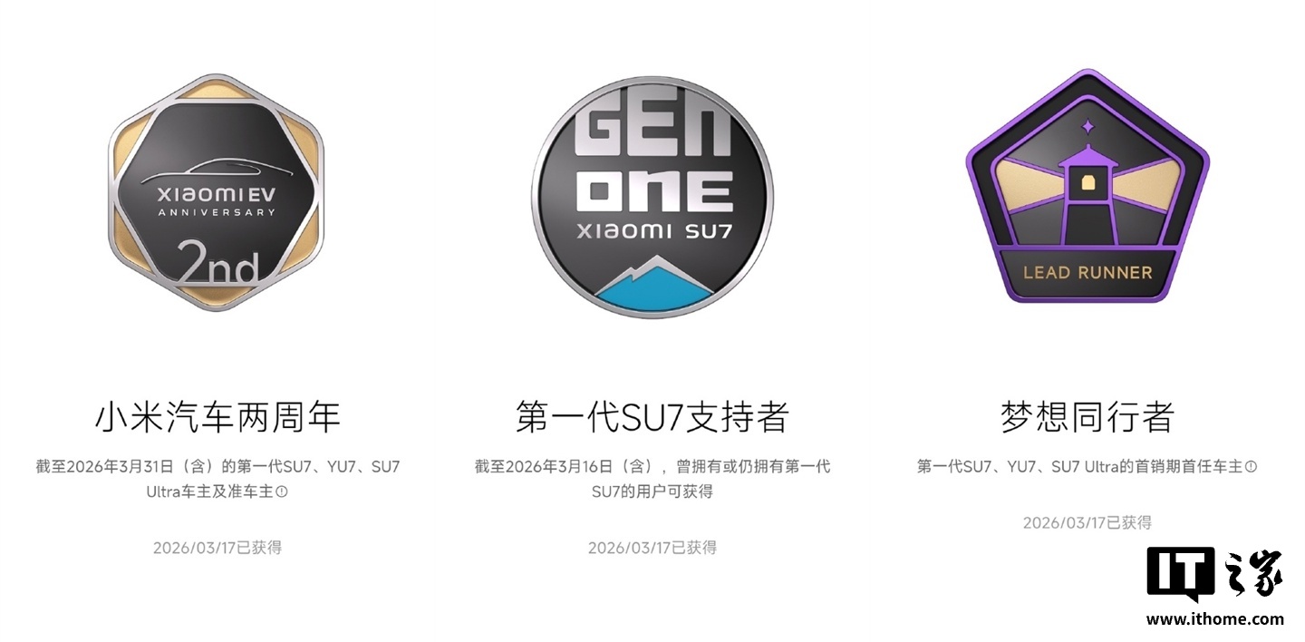 具体来说,“小米汽车两周年纪念勋章”面向本月底前购买SU7、YU7、SU7Ultra的车主(含准车主)开放领取;“第一代SU7支持者勋章”面向所有购买过初代小米SU7的用户领取;“梦想同行者勋章”则专属于初代SU7、YU7、SU7Ultra首销期的首任车主。此外,小米汽车还为车主准备了定价19.9元的卡布里蓝色、仿实体钥匙造型的XiaomiLife定制冰箱贴,要求车辆仍在原购车账号名下且未换绑,同一车型限购一个,单个账号最多可领取三张购买券。