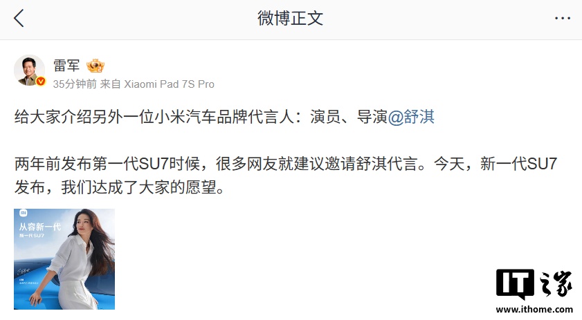 今日,小米汽车宣布演员舒淇和中国田径短跑运动员苏炳添成为品牌代言人。小米创办人雷军透露,两年前发布第一代SU7时,网友便建议邀请舒淇代言,如今新一代SU7发布,实现了网友的愿望。苏炳添不仅是第一代小米SU7的车主,还与小米有过合作,早在2021年就成为了小米品牌代言人。