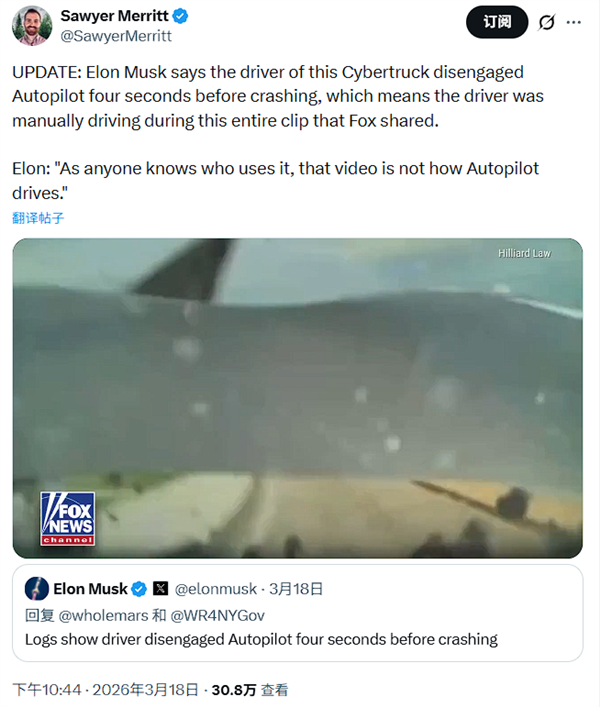马斯克在社交平台上回应了这一事件,指出驾驶日志显示驾驶员在碰撞前四秒主动关闭了Autopilot功能。特斯拉能够调取旗下所有车辆的运行日志,记录包括FSD或Autopilot是否开启、油门是否踩下、车速等关键数据。这一回应暗示事故可能与驾驶员操作有关,而非车辆自身问题。