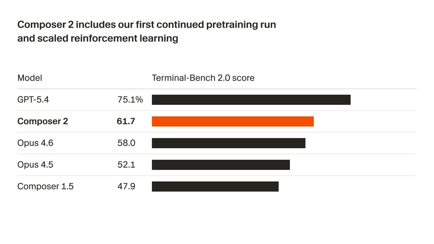 Composer2和Composer2Fast并非通用独立大模型,而是严格锁定在Cursor生态内的专属引擎,未通过外部平台提供API接口,而是深度集成了Cursor自身的工具栈。与传统模型不同,Composer2的核心发力点在于处理包含数百个操作的复杂任务,能够在Cursor环境内顺畅地阅读代码库、决定修改方案、编辑多个文件并运行终端命令,扮演“AI软件工程师”的角色。在第三方基准测试中,Composer2在衡量终端操作能力的Terminal-Bench2.0测试中得分61.7,虽然低于行业标杆GPT-5.4的75.1,但Cursor强调Composer2在日常编程任务中能以远低于顶级模型的成本提供足够优秀的智能表现。