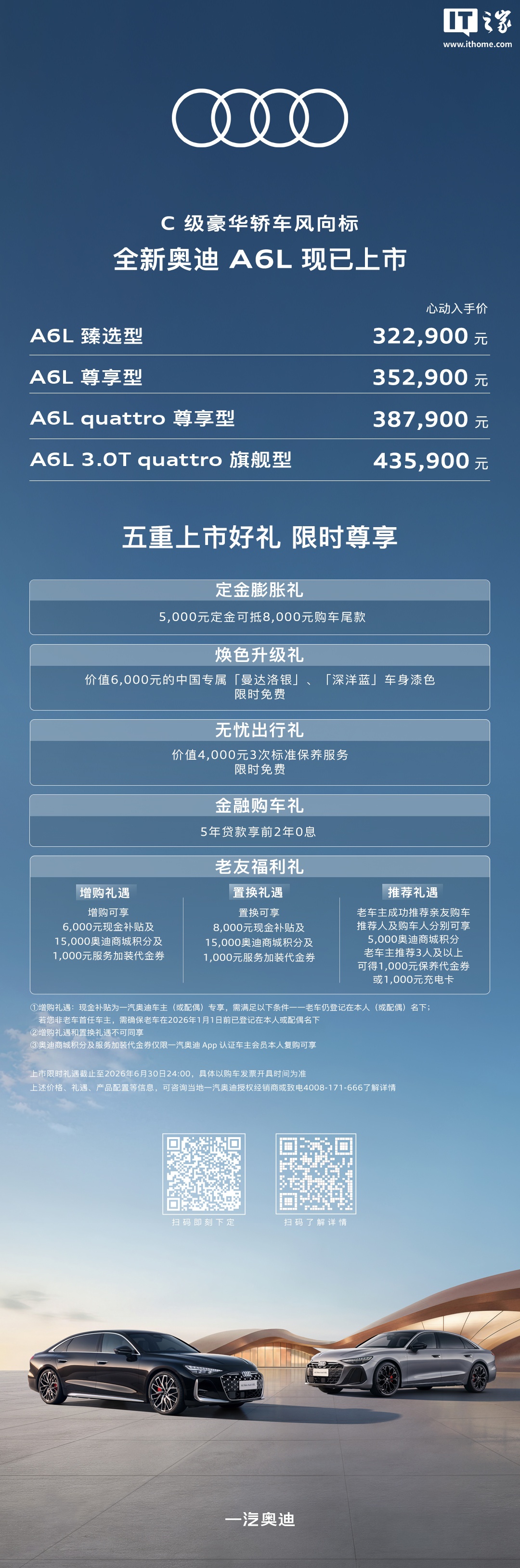 3月25日,全新奥迪A6L正式上市,推出4款车型,官方指导价为32.29-43.59万元。新车基于奥迪全新PPC燃油车平台打造,轴距加长42mm至3066mm,车身长度增加92mm达5142mm,强化后排空间。外观提供行政风格与运动风格两种方案,配备星辰矩阵大灯和第二代OLED尾灯,支持个性化签名及车联网通信功能。内饰方面,配备11.9英寸虚拟座舱、14.5英寸MMI全景显示屏及可选装的10.9英寸副驾娱乐屏,采用曲面OLED技术,并配备13.1英寸W-HUD抬头显示。车机系统集成70款车载应用,支持远程控车及6种场景模式。座椅方面,3.0T旗舰车型采用Nappa真皮材质,前排支持18向电动调节,后排靠背可调至35°,并配备通风、按摩功能。音响系统标配16扬声器Bang&Olufsen,可选装20扬声器版本。