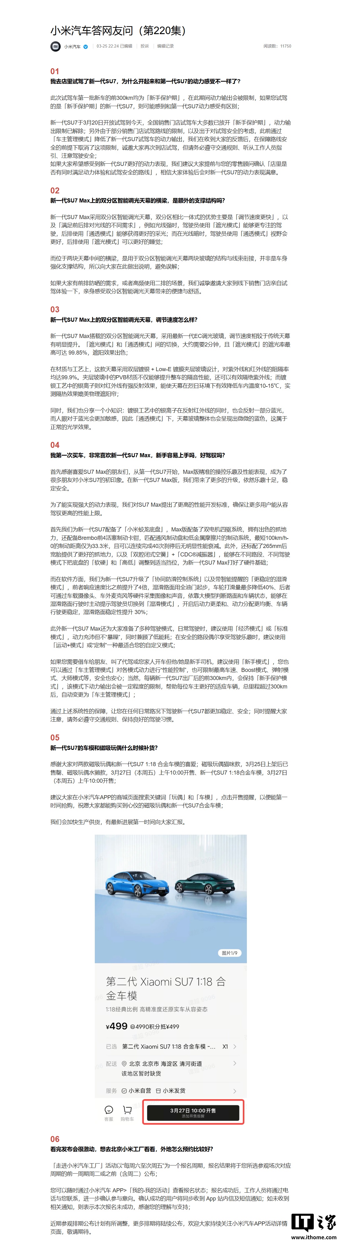 今日,小米汽车官方发布答网友问(第220集),针对新一代SU7试驾体验与第一代SU7动力感受差异、新一代SU7Max新手易上手性等问题进行了详细解答。新一代SU7在前300km为“新手保护期”,动力输出受限,全国销售门店试驾车大多数已解除限制。同时,小米汽车取消了因试驾路线限制而降低动力输出的“车主管理模式”,并邀请用户体验新一代SU7的动力表现。