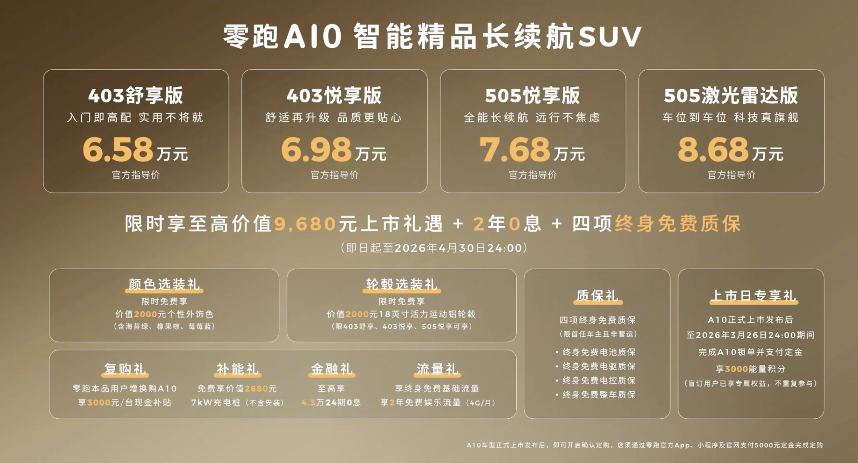 3月26日,零跑汽车宣布其“智能精品长续航SUV”新车A10正式上市,售价区间为6.58万至8.68万元。新车共提供四款配置,包括403舒享版、403悦享版、505悦享版和505激光雷达版。零跑A10采用“科技自然美学2.0”设计语言,具有封闭式格栅和多边形大灯组,车尾多边形尾灯与前脸呼应,提供六种车身配色。智能化配置上,A10搭载SA8155座舱芯片与SA8650辅助驾驶芯片,配备激光雷达,支持高级别智能驾驶功能。座舱内部设计简洁,标配双辐式多功能方向盘、8.88英寸全液晶仪表和14.6英寸2.5K分辨率悬浮式中控屏,同时配备车内氛围灯、手机无线充电区域及双杯架等实用性配置。零跑A10还将接入千问AI大模型,搭载“超级小零”智能助手,提升人机交互的自然度与智能化水平。车身尺寸为4270/1810/1635mm,轴距2605mm,定位小型SUV。动力方面,新车搭载最大功率90kW的驱动电机,提供39.8kWh和53kWh两种