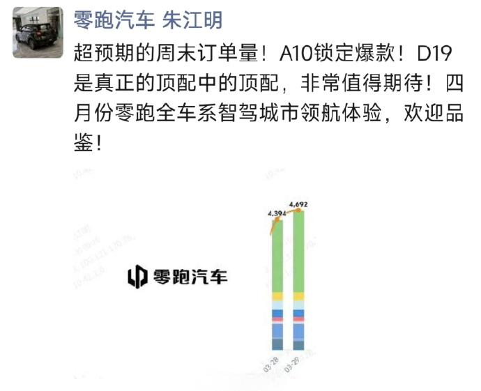 3月30日消息,零跑A10在刚刚过去的周末(3月28日至29日)迎来订单爆发,两天大定订单突破9000台,其中周六4394台、周日4692台。零跑汽车CEO