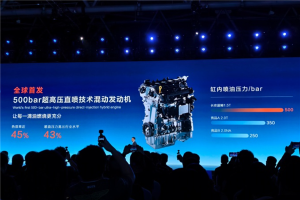 3月30日,长安汽车举办了蓝鲸超擎动力全球发布会,宣布蓝牌家轿城区油耗进入2L时代,蓝牌SUV城区油耗进入3L时代。蓝鲸超擎动力全球首发500bar超高压直喷技术混动