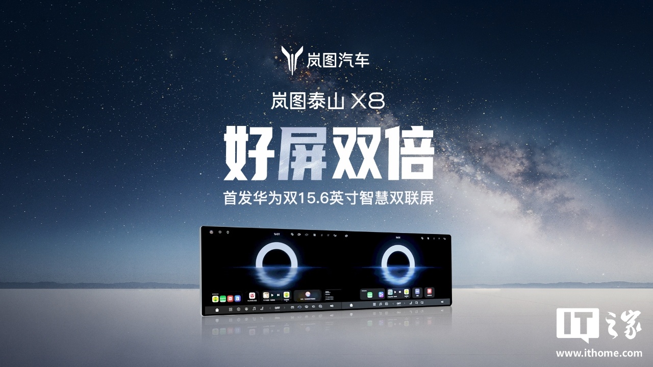 3月31日,岚图汽车官方宣布,其即将推出的岚图泰山X8车型将首发搭载华为双15.6英寸智慧双联屏。该双联屏配备旗舰级硬件,支持高亮超清显示,能够实现双屏协同操作,并支持三指飞屏和一键流转功能。此外,该系统还提供分区独立娱乐能力,允许用户在互不干扰的情况下分别使用。岚图泰山X8的双联屏设计还特别强调了极窄边框的视觉效果。