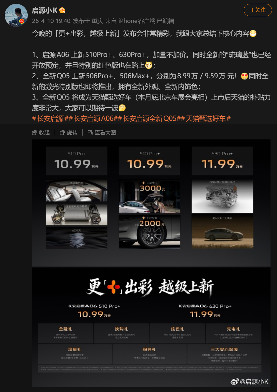 4月10日,长安汽车宣布旗下两款新能源汽车——长安启源A06和全新Q05正式上市,起售价为8.99万元。长安启源A06在外观上延续了弧线型贯穿灯带和扶光美学设计,车身尺寸为4885*1916*1496mm,轴距2922mm。内饰方面,A06配备了环抱式座舱和大尺寸液晶仪表及中控屏,搭载4nm工艺MTK8676车规级芯片。动力方面,A06提供800V高压SiC碳化硅平台,可选两种磷酸铁锂