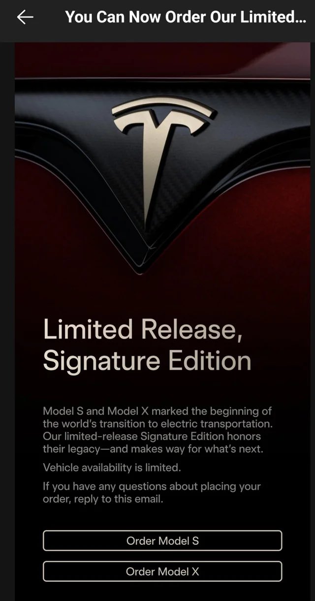 Model S签名版配备碳陶刹车系统与金色卡钳,Model X签名版则换装了22英寸超大Machina轮毂。两款车型均标配“豪华套装”,包含FSD(辅助版)、免费超级充电、四年高级服务,以及车辆终身免费高级车载互联服务。Model S与Model X签名版单车售价为159,420美元,较现有在售车型大幅上涨。特斯拉美国库存中的全新Model X已基本售罄,仅余少量展车。随着特斯拉准备将弗里蒙特工厂生产线转向Optimus人形机器人与即将推出的大众市场车型,Model S与Model X的停产将在高端市场留下巨大空缺。