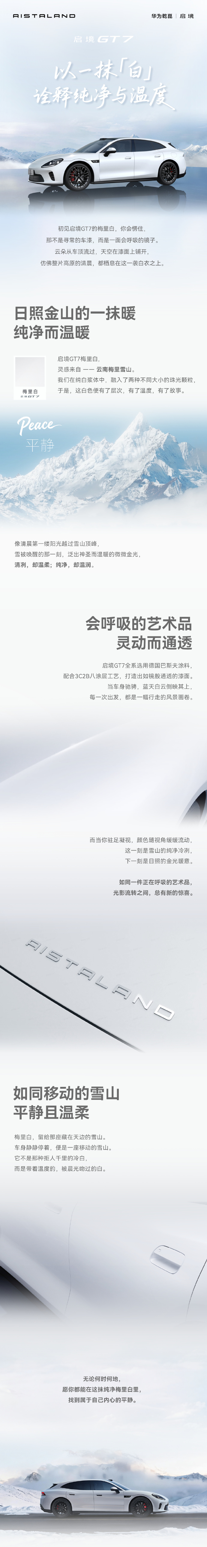 今日,启境汽车发布了启境GT7“梅里白”车色的官方图片,该车型采用全系德国巴斯夫涂料,并结合3C2B八涂层工艺,旨在打造如镜面般通透的漆面效果。启境GT7是广汽与华为乾崑合作的智能猎装车型,预计将于6月举行上市发布会,届时将公布正式售价、配置及交付细节。新车计划上市即交付,交付周期将根据车型配置、锁单及确认交付方案的时间有所变化。
