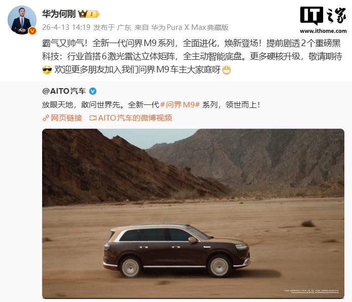 4月13日,AITO汽车官方公布了全新一代问界M9的官方影像,并提出了“敢问世界先”的口号。华为终端BG首席执行官何刚透露,全新一代问界M9系列将搭载两项重磅黑科技:行业首搭6激光雷达立体矩阵和全主动智能底盘。此外,何刚已更换为最新的华为PuraXMax典藏版阔折叠新机。