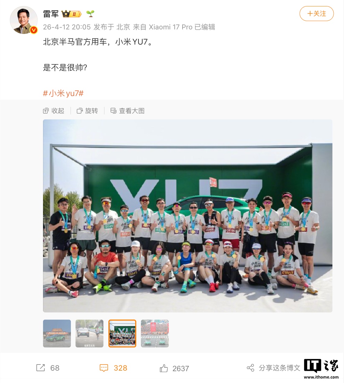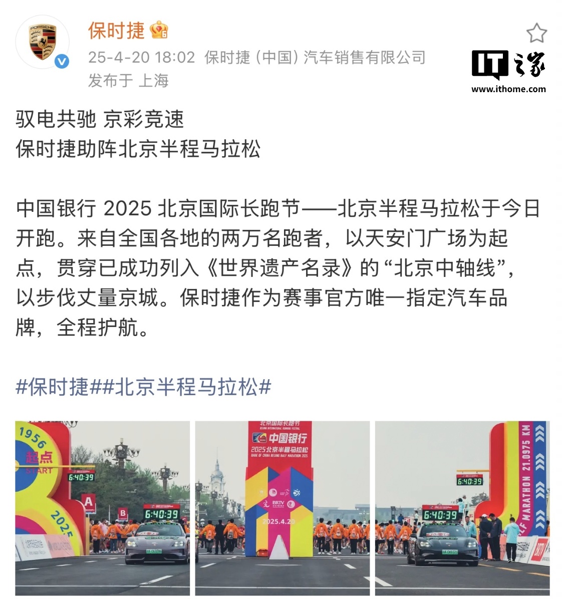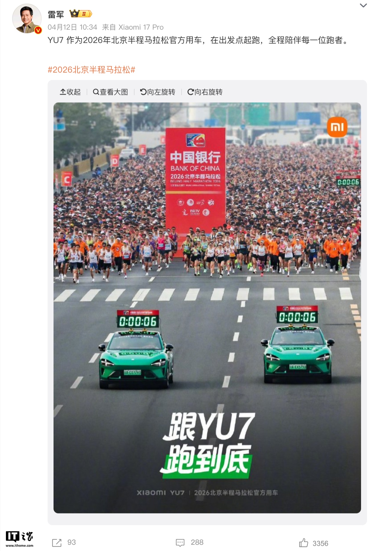 小米YU7作为本次马拉松的官方用车,出现在了活动的现场。两辆小米YU7汽车在人群前方行驶,车顶装有计时标牌。此外,超过20位小米汽车车主和30多位小米员工参与了这次马拉松。比赛结束后,不少选手选择在YU7汽车前合影留念。2026北京半程马拉松全程21.0975公里,选手们从天安门广场出发,经过北京中轴线,最终到达国家体育场鸟巢。沿途共设有7个补给站和1300个厕位。与去年官方用车为保时捷车型相比,今年的变化引人注目。