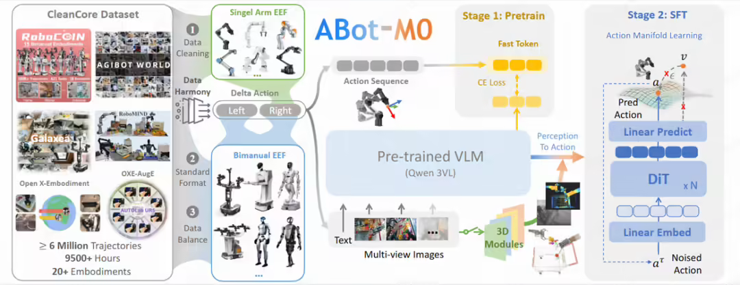 高德于3月31日宣布正式全量开源ABot-M0,这是全球首个基于统一架构的机器人具身操作基座模型,能够实现一个“通用大脑”适配多种形态的具身机器人。ABot-M0模型在Libero、Libero-Plus、RoboCasa等多个权威基准测试中实现了SOTA(State of the Art)成绩。特别是在Libero-Plus基准上,该模型的任务成功率达到了80.5%,相较于业界此前的标杆方案Pi0提升了近30%。