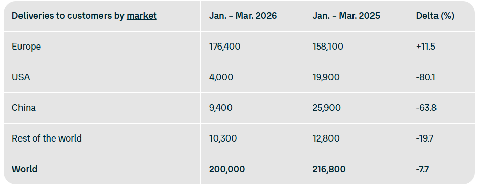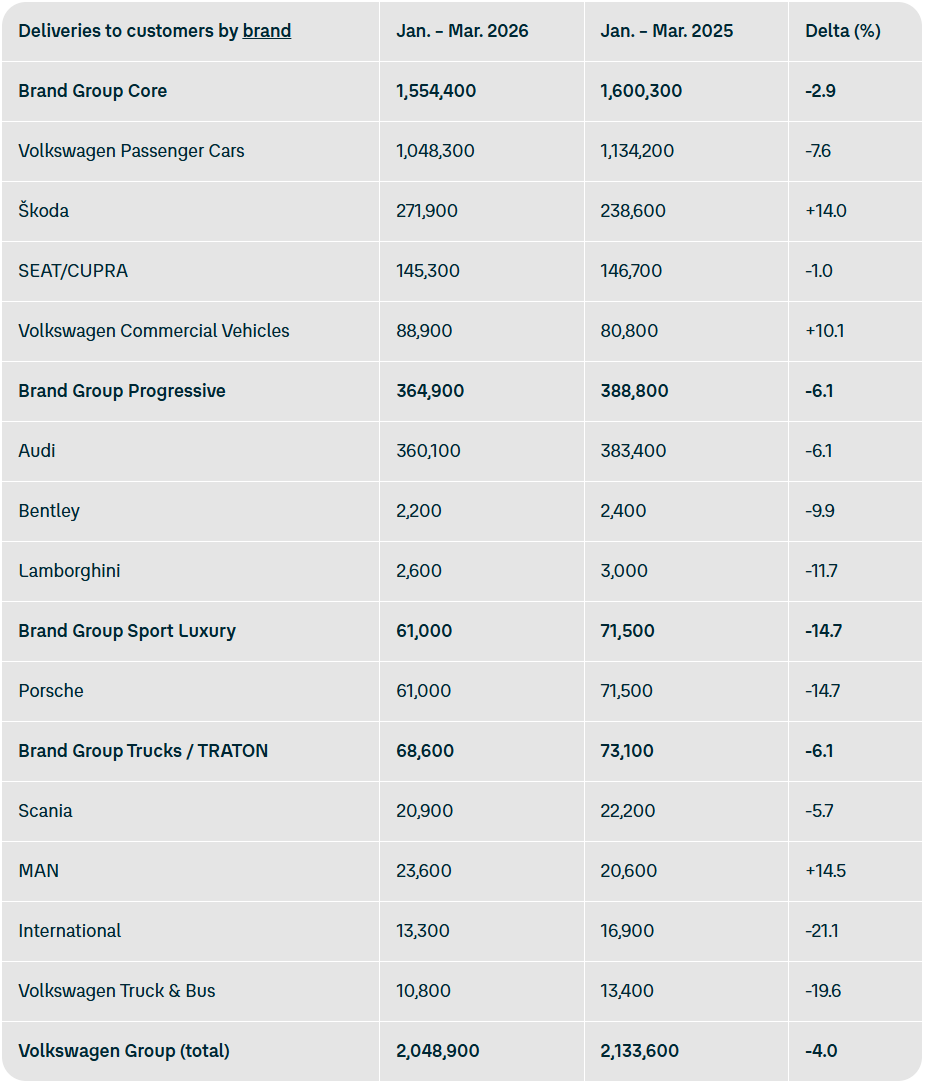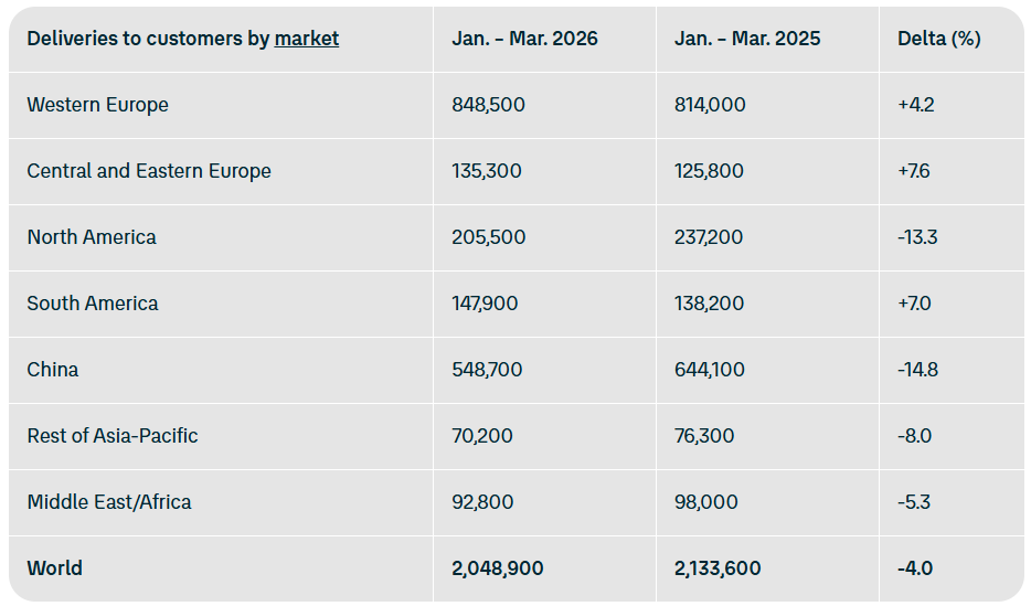 4月14日,大众汽车集团发布最新数据,2026年第一季度全球交付量为204.89万辆,同比下降4%。其中,中国市场交付量大幅下滑14.8%,美国市场锐减20.5%。尽管如此,大众在欧洲市场保持增长,西欧交付量增长4.2%,中欧和东欧增长7.6%。在