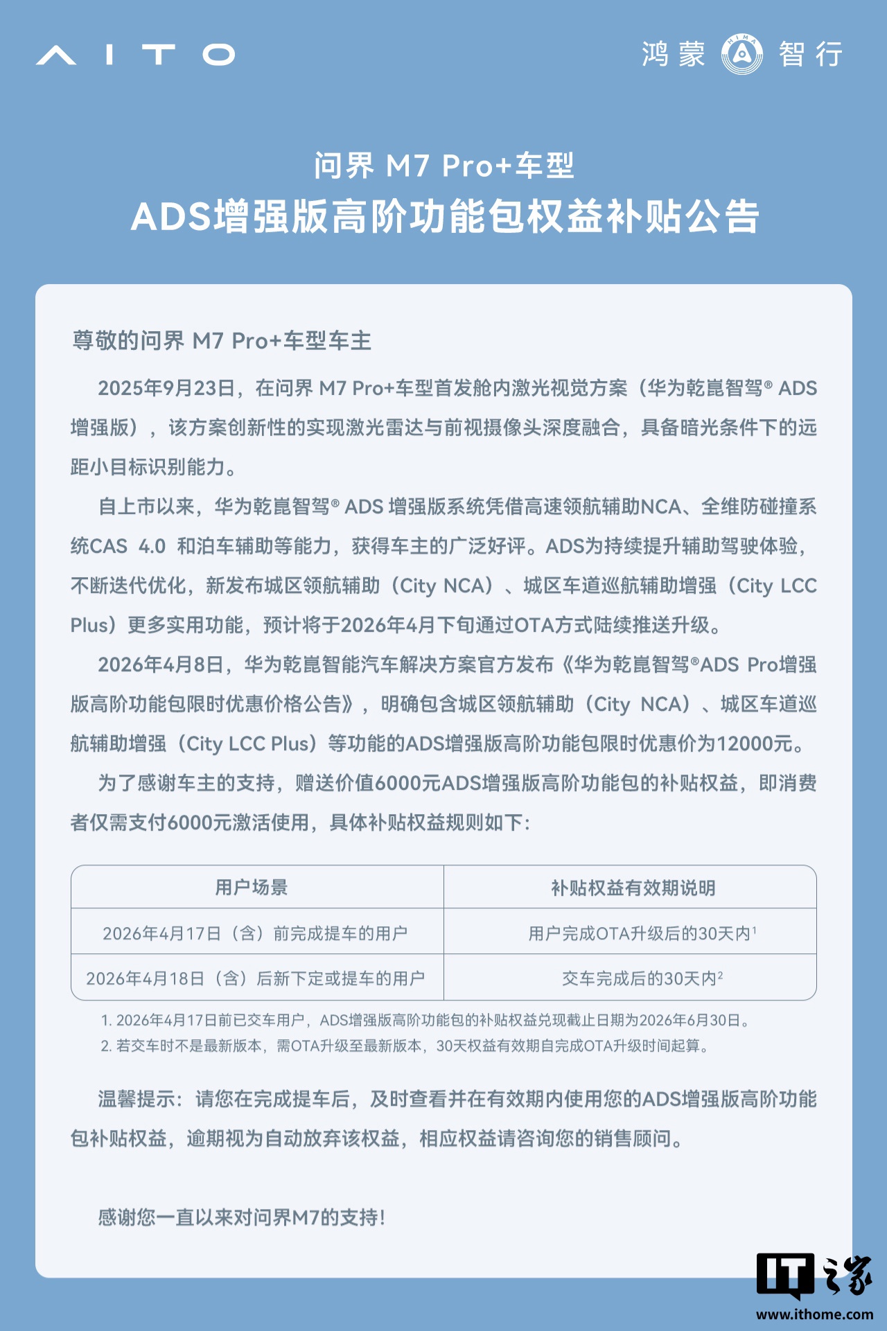 今日,鸿蒙智行官方宣布,问界M7Pro+版将于2026年4月下旬开启OTA推送,新增城区领航辅助等功能。华为乾崑智能汽车解决方案官方发布公告,ADS增强版高阶功能包限时优惠价为12000元,现赠送价值6000元限时