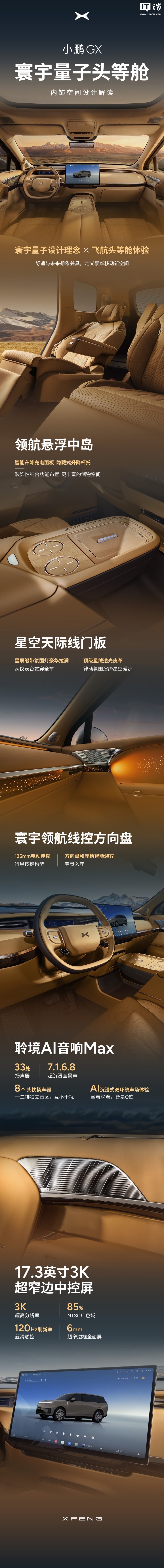 4月14日,小鹏汽车官方公布了其旗舰SUV小鹏GX的内饰细节。小鹏GX将配备“寰宇量子头等舱”,包括“领航悬浮中岛”设计,升降充电面板和隐藏式杯托,以及“星空天际线门板”设计,配备星辰灯带和星绒透光皮革。此外,小鹏GX还搭载了“寰宇线控方向盘”,支持电动伸缩和智能迎宾功能,以及聆境AI音响Max和17.3英寸3K超窄边大屏。