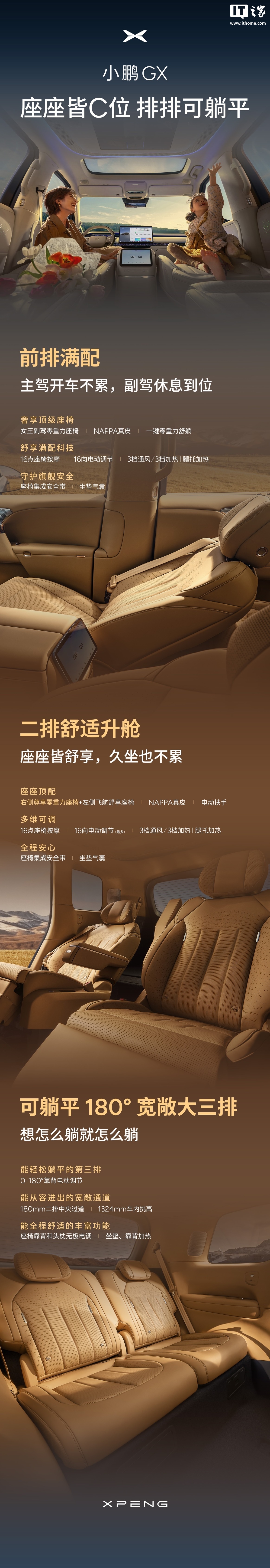 小鹏GX旗舰SUV支持“三排皆可躺”特性,副驾座椅采用NAPPA真皮,集成按摩、电动调节、通风加热等功能。第二排提供零重力座椅和飞航舒享座椅,第三排支持0-180°电动躺平。新车还首发同级唯一的三排电动三折叠功能,第三排支持5/5独立电动收纳,提供多种空间组合方式。