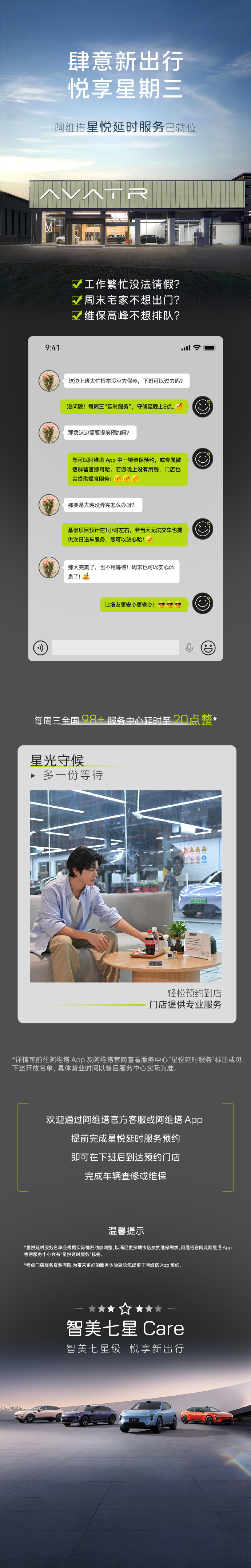 4月15日,阿维塔科技总裁陈卓宣布,公司将推出星悦延时服务,每周三全国98+服务中心将延时服务至晚上8点。去年11月21日,阿维塔在
