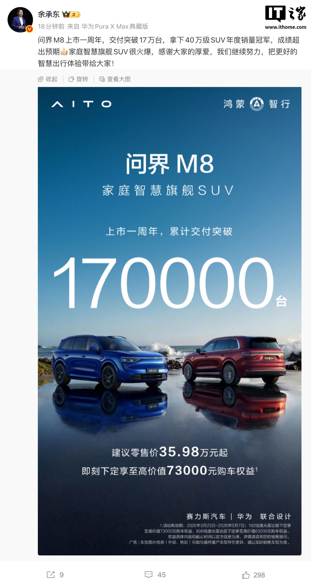 今日,华为常务董事余承东宣布,问界M8上市一周年,交付量突破17万台,成为40万级SUV年度销量冠军。今年3月,问界M8新增“瑞红”“湛蓝”配色,搭配21英寸曜影运动轮毂,起售价36.98万元。问界M8首批搭载HUAWEI ADS 4,配备华为192线激光雷达、1个后向高精度固态激光雷达、5个4D毫米波雷达,支持主动安全、智能驾驶辅助、智能泊车辅助。纯电版首发搭载华为高压七合一电驱,全系标配