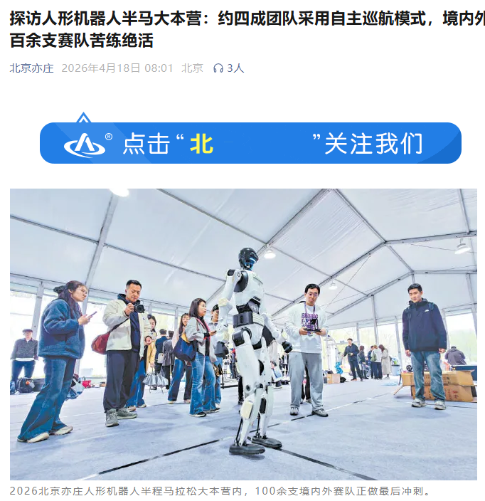 4月18日,北京亦庄公众号报道,2026北京亦庄人形机器人半程马拉松大本营内,100余支境内外赛队正进行最后准备。本届赛事规模和难度均创新高,约四成团队采用自主巡航模式,各队水平普遍提升。勇士挑战赛设17项障碍,考验机器人在复杂地形下的应变能力,多个队伍同时参加半马和勇士挑战赛。