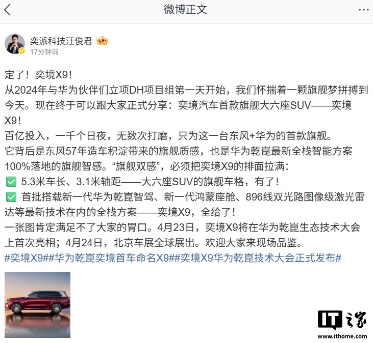今日,东风奕派汽车科技公司总经理汪俊君宣布,奕境汽车首款旗舰大六座SUV命名为奕境X9。这款SUV拥有5.3米的车长和3.1米的轴距,首批搭载的技术包括新一代华为乾崑智驾、新一代鸿蒙座舱以及896线双光路图像级激光雷达等最新技术在内的全栈方案。奕境X9将在4月23日的华为乾崑生态技术大会上首次亮相,并在4月24日的