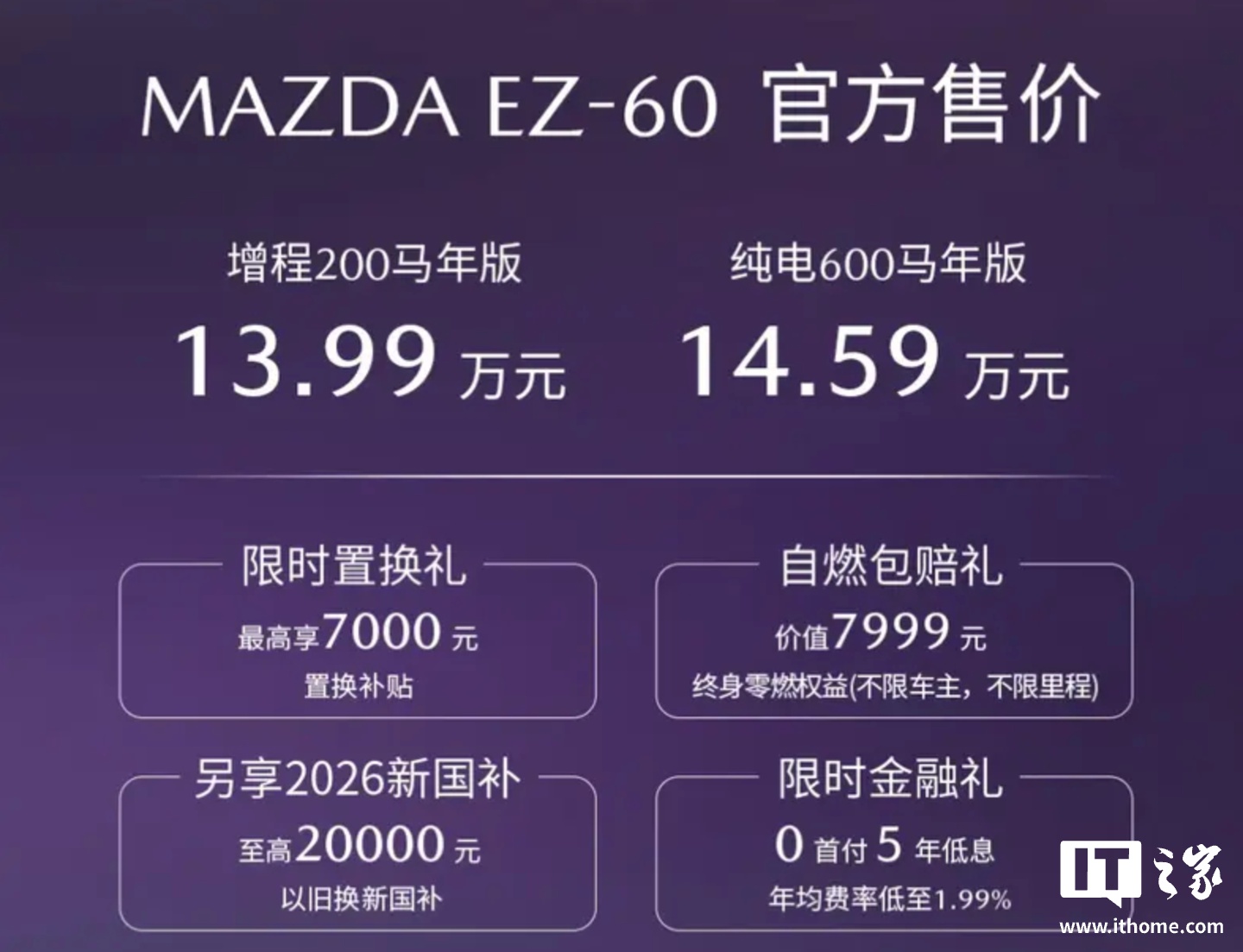 4月21日,马自达宣布EZ-60马年特别版车型正式上市,起售价为13.99万元。该车型在外观上延续了封闭式前脸设计,配备可发光车标和隐藏式门把手,同时提供电子外后视镜选项。车身细节如前后轮眉和车门下边缘采用亮黑色材质,并带有“MAZDA”英文标识。车尾设计包括贯穿式尾灯组和后扰流板,匹配21英寸轮毂。