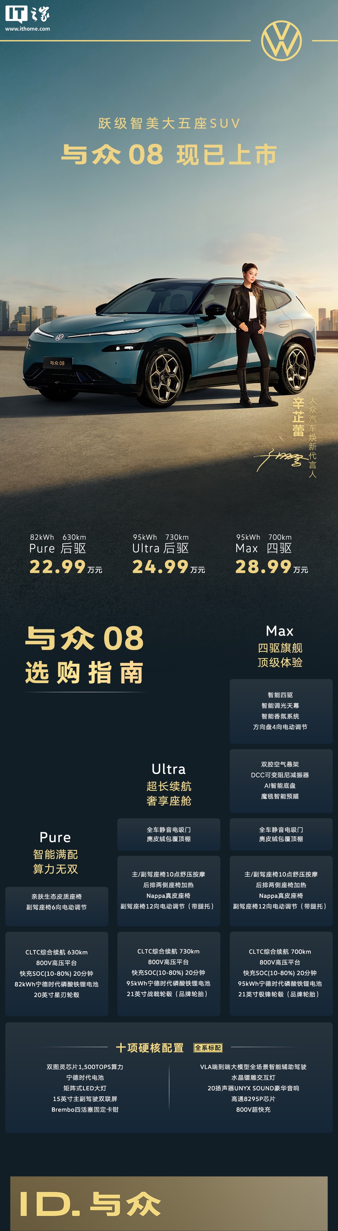 此外,4月16日,大众汽车与小鹏汽车联合开发的首款车型“与众08”正式上市,价格区间为22.99万元至28.99万元。这款车型搭载了800伏高压超快充平台,并全系标配小鹏汽车VLA全场景智能驾驶辅助系统。车辆还搭载了高通8295P芯片,拥有同级领先的1500TOPs智驾算力,并采用