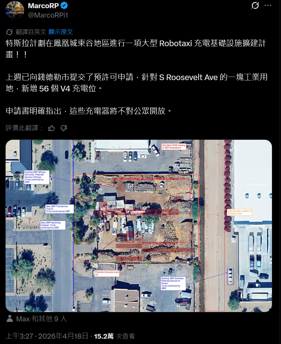 充电站建设计划。特斯拉共提交了两座超充站的建设申请,一座位于马里科帕县钱德勒市南罗斯福大道,另一座位于凤凰城梅萨市5349东主道。这两座充电站均配备V4