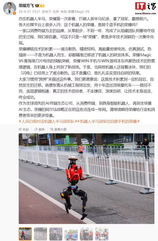 4月19日,2026北京亦庄人形机器人半程马拉松圆满结束,荣耀齐天大圣队研发的人形机器人“闪电”以50分26秒的成绩夺得冠军,打破了人类半程马拉松的世界纪录。荣耀旗下机器人包揽了赛事前六名,展现了其在具身智能硬件领域的技术实力。荣耀终端股份有限公司产品线总裁方飞表示,这一成绩是荣耀多年技术深耕的成果,将消费电子领域的技术能力迁移到机器人研发中,实现了精准落地。