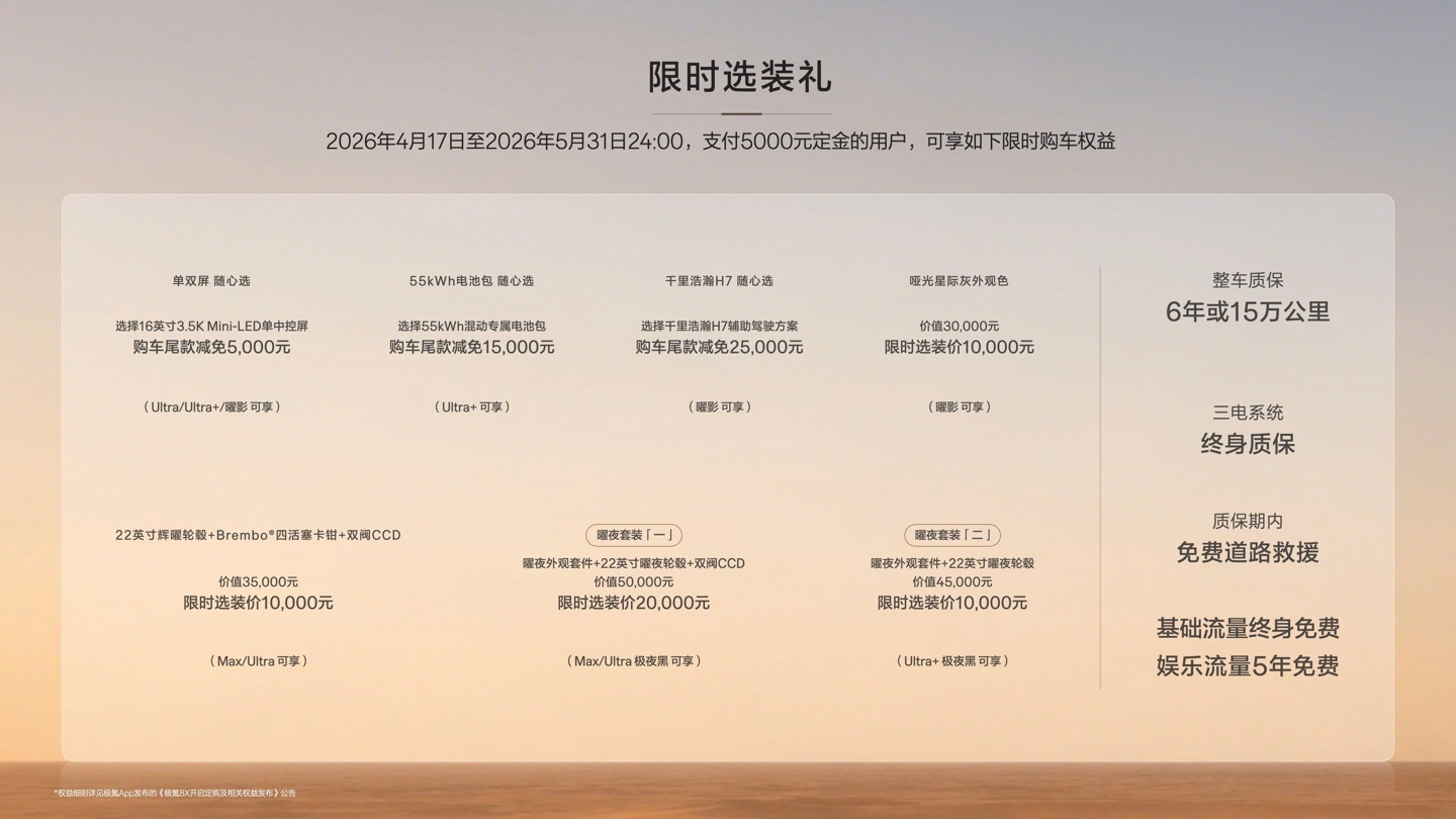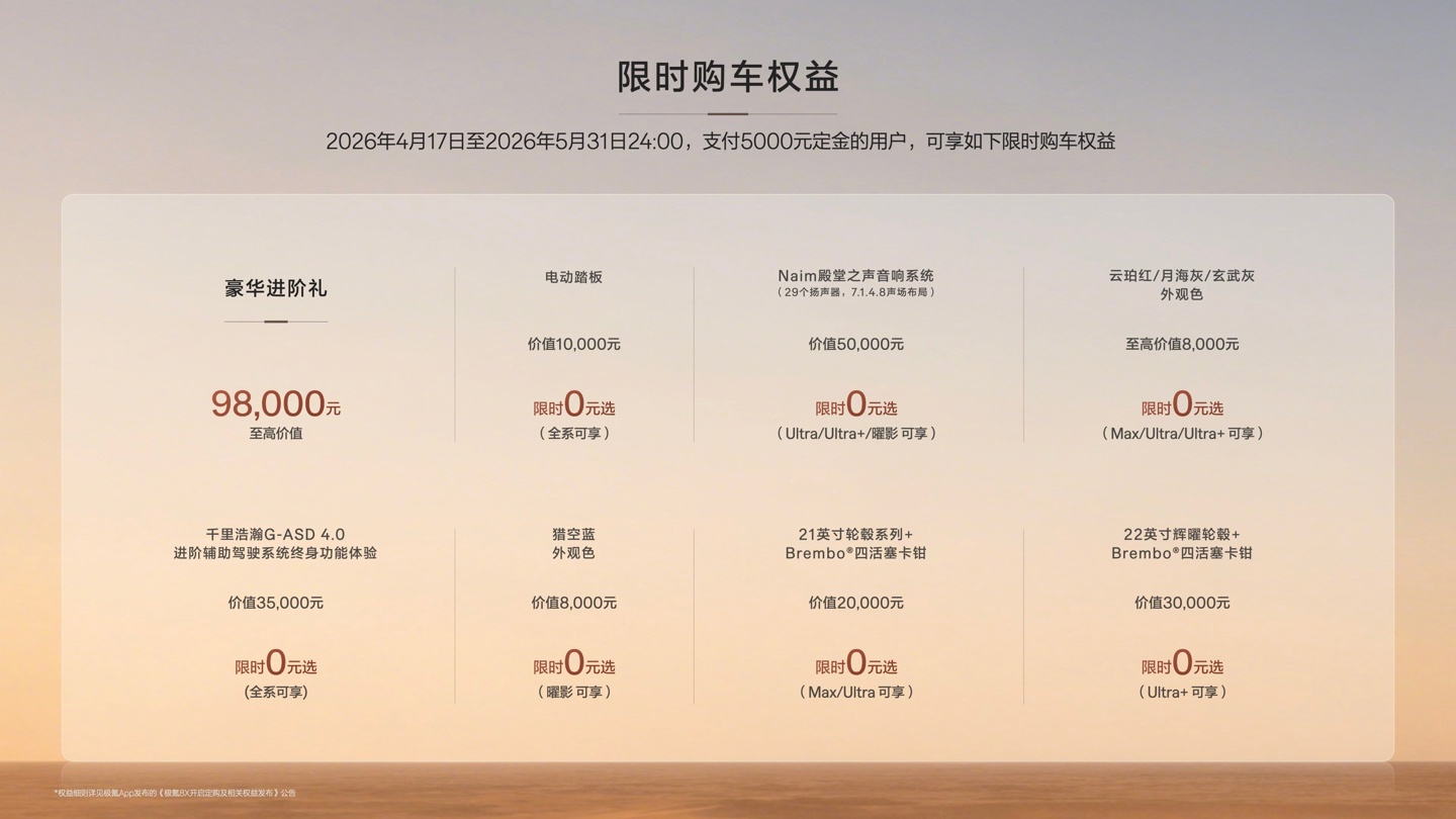 极氪8X于4月17日正式上市,官方指导价35.68万元起。具体价格如下:极氪8X Max版本35.68万元,叠加首发权益32.98万元起;极氪8X Ultra版本37.68万元,叠加首发权益34.98万元起;极氪8X Ultra+版本42.68万元,叠加首发权益39.98万元起;极氪8X曜影50.08万元,叠加首发权益47.38万元起。