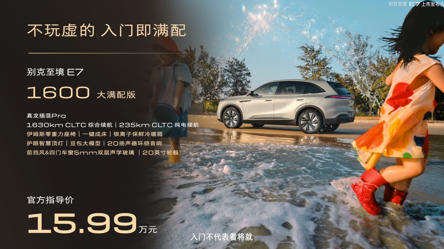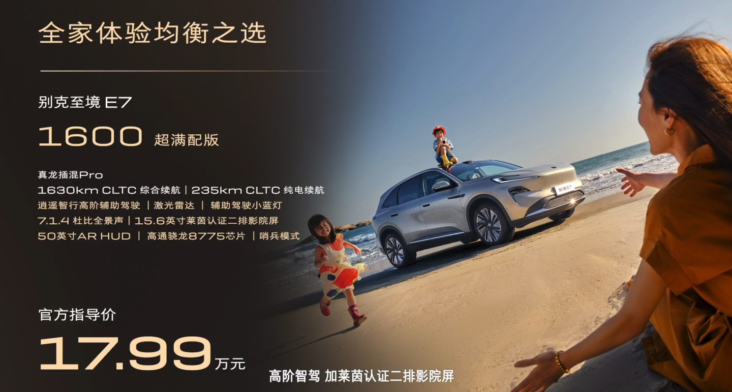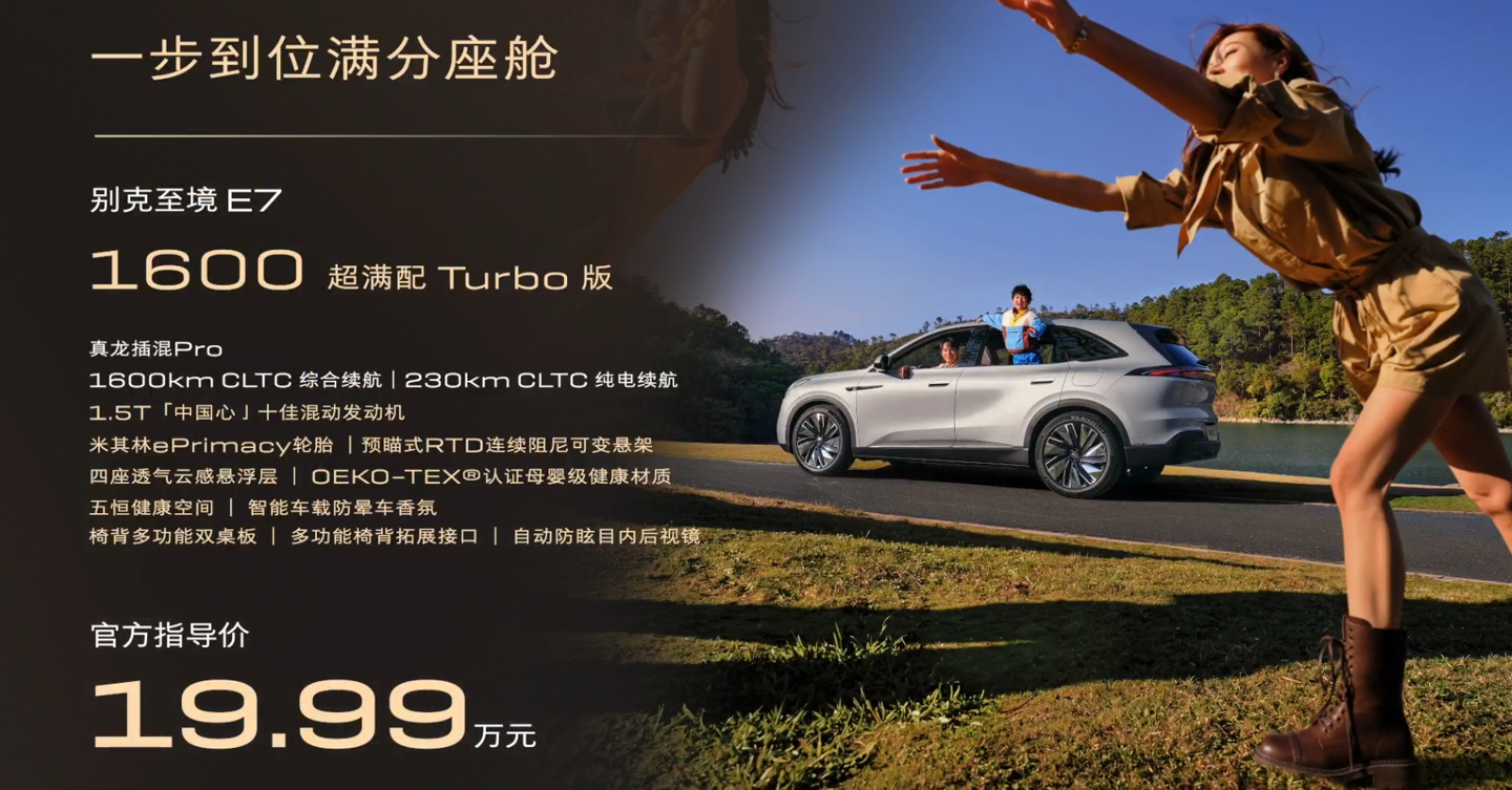 今日,别克高端新能源品牌“至境”旗下首款SUV——别克至境E7正式上市,官方指导价15.99万元起。新车提供三款配置,分别为1600大满配、1600超满配和1600超满配Turbo版。外观方面,至境E7延续了至境SUV先导车的飞翼造型,采用封闭式前脸,配备分体式大灯,车身侧面采用半隐藏式车门把手,车身尺寸为4850x1910x1676mm,轴距2850mm。座舱方面,别克至境E7提供四座悬浮层座椅,支持多种模式切换,副驾配备伊姆斯零重力躺椅,前后排座椅均具备三档加热与三档通风功能。