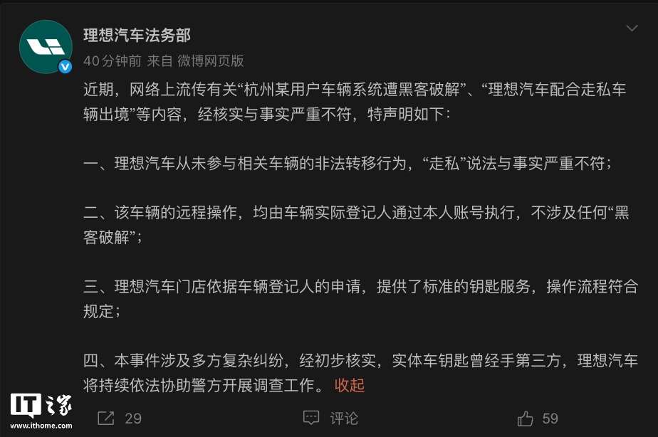 近日,理想汽车法务部官方微博发布声明,针对网络上流传的“杭州某用户车辆系统遭黑客破解”和“理想汽车配合走私车辆出境”等不实信息进行辟谣。声明中明确指出,理想汽车从未参与任何非法转移车辆的行为,所谓的“走私”说法与事实严重不符。