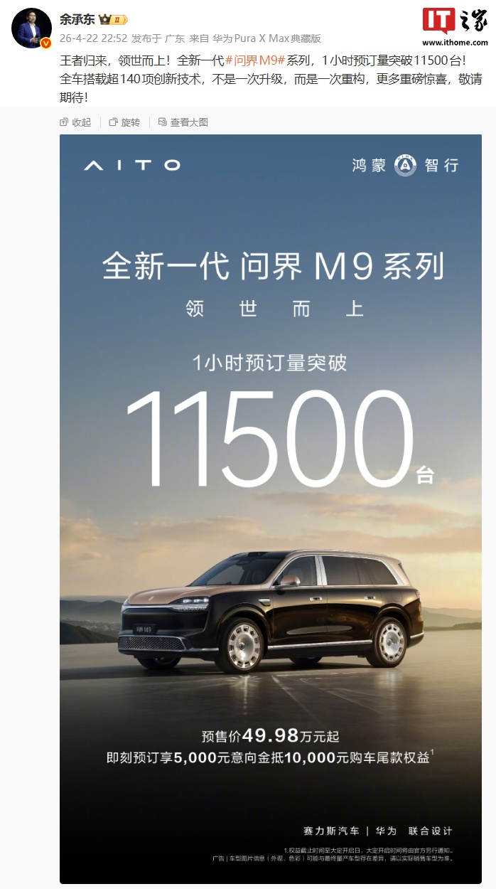 4月22日,华为常务董事余承东宣布,全新一代问界M9系列在1小时内预订量突破11500台。余承东强调,问界M9系列全车搭载超140项创新技术,不仅仅是一次升级,而是一次全面的重构,未来还将公布更多惊喜。目前,华为官网已经开启了新车预订,相关页面曝光了更多配置信息。