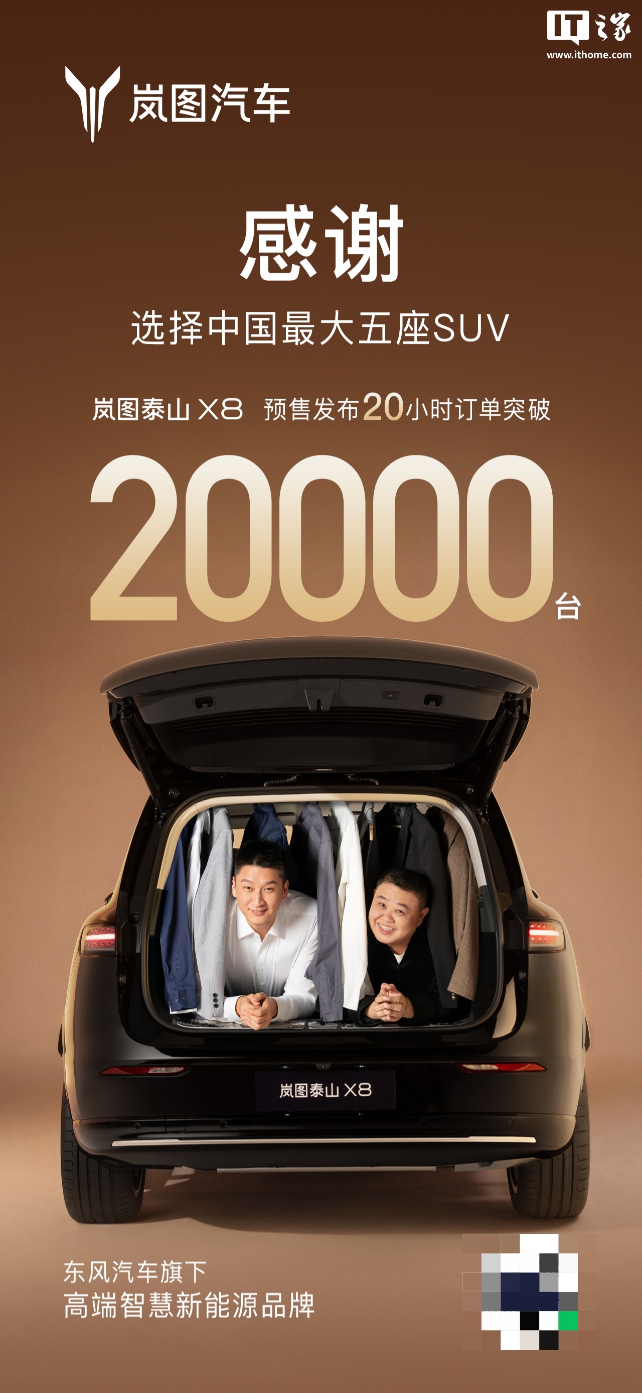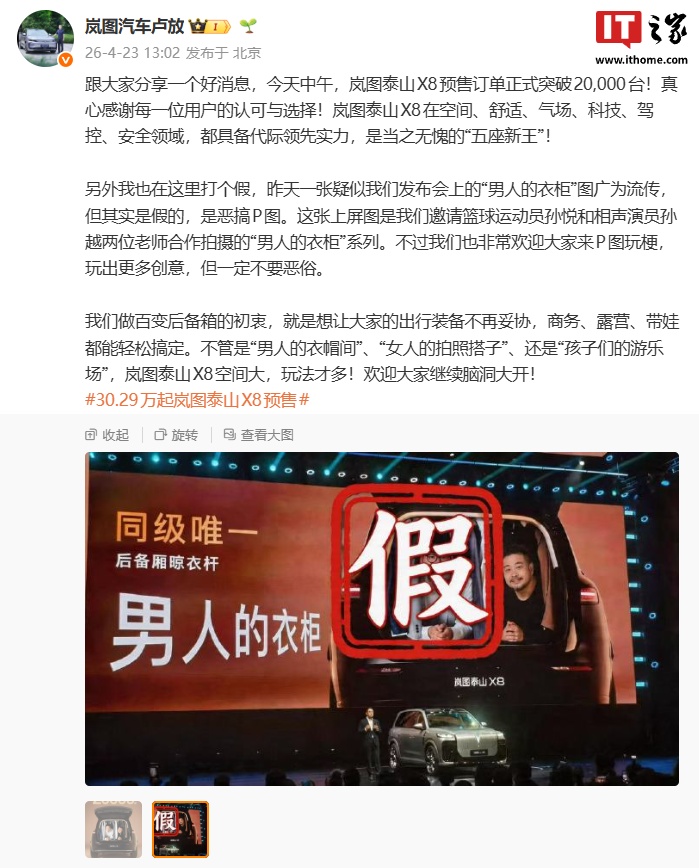 今日,岚图汽车科技股份有限公司董事长卢放宣布,岚图泰山X8预售订单已突破2万台。卢放同时对网传的发布会“男人的衣柜”图进行了辟谣,指出该图为恶搞P图,实际是岚图汽车邀请篮球运动员孙悦和相声演员孙越合作拍摄的“男人的衣柜”系列。卢放鼓励大家发挥创意,但强调不应恶俗。