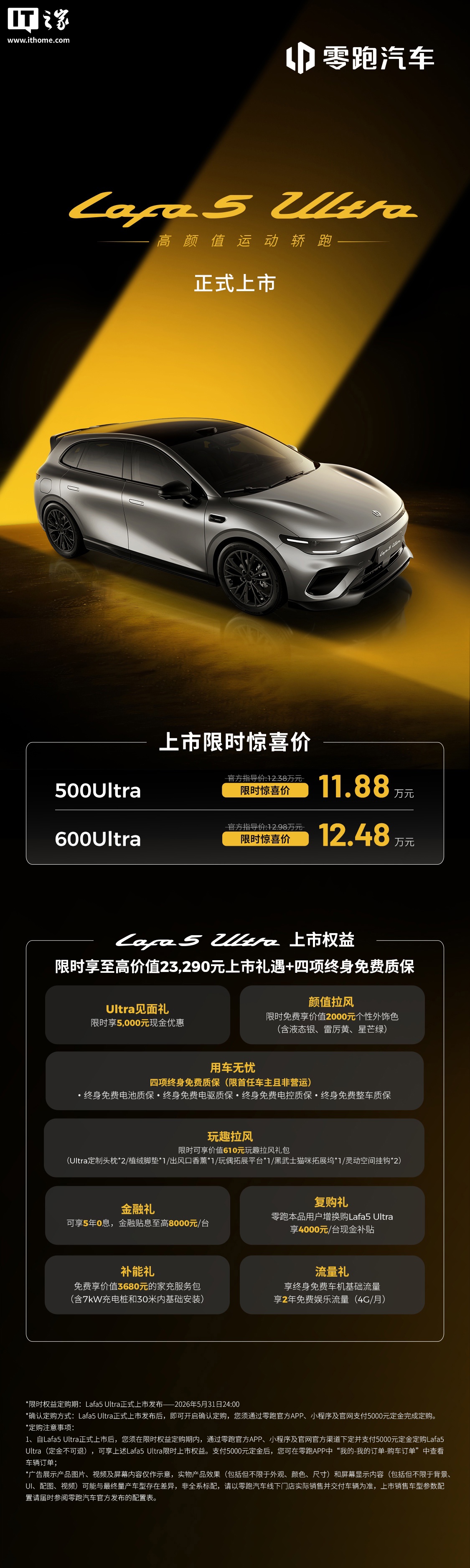 北京车展上发布了全新车型Lafa5 Ultra,起售价为11.88万元。该车型提供500Ultra和600Ultra两个版本,分别定价11.88万元和12.48万元。Lafa5 Ultra在外观上搭载了专属运动套件,包括破风前铲、风翼侧裙、驭风尾翼及尾部扩散器,车身采用隐藏式门把手,配备19英寸掠翼枪灰轮毂和哑光金属深灰卡钳,与普通版形成明显差异。