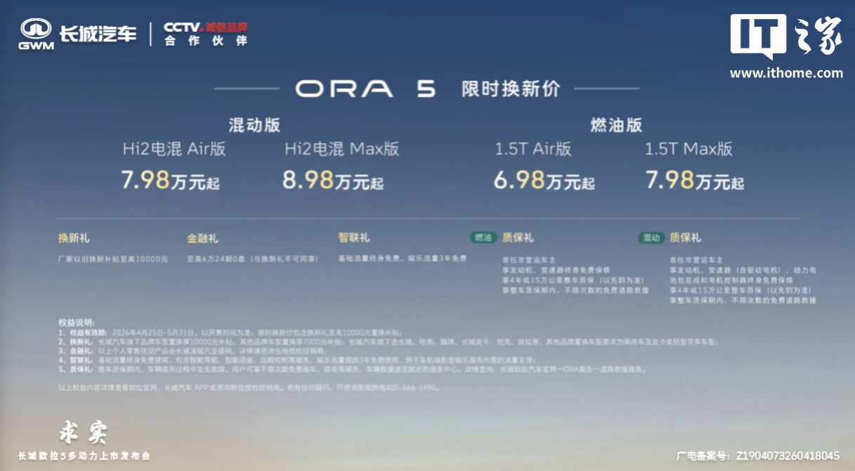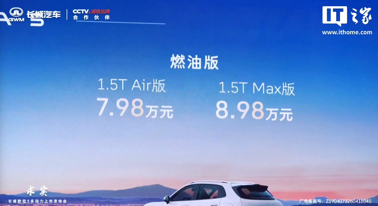 北京车展上,长城汽车旗下品牌欧拉5的燃油版和混动版车型正式上市,起售价分别为7.98万元和8.98万元,限时换新价更低至6.98万元起。欧拉5混动版搭载全新一代Hi2智能混动技术,与Hi4技术同源,系统功率达166kW,峰值扭矩476N·m,提供平顺的驾驶体验。燃油版则配备长城汽车第六代1.5T高效