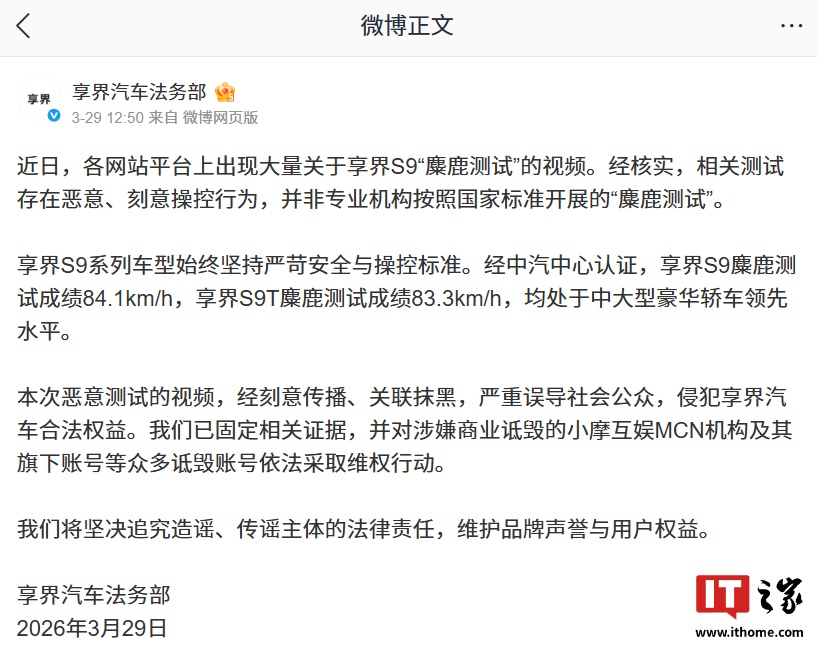 此前,享界汽车法务部已发表声明,称网络上流传的关于享界S9麋鹿测试的视频存在恶意操控,并非按照国家标准进行的专业测试。享界汽车已对相关责任方小摩互娱MCN追究责任。这些声明和行动表明,享界汽车对于维护品牌形象和产品声誉持严肃态度,并对不实信息和恶意行为采取了法律措施。