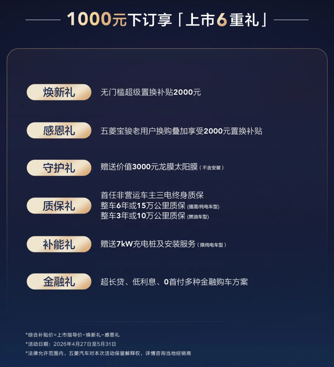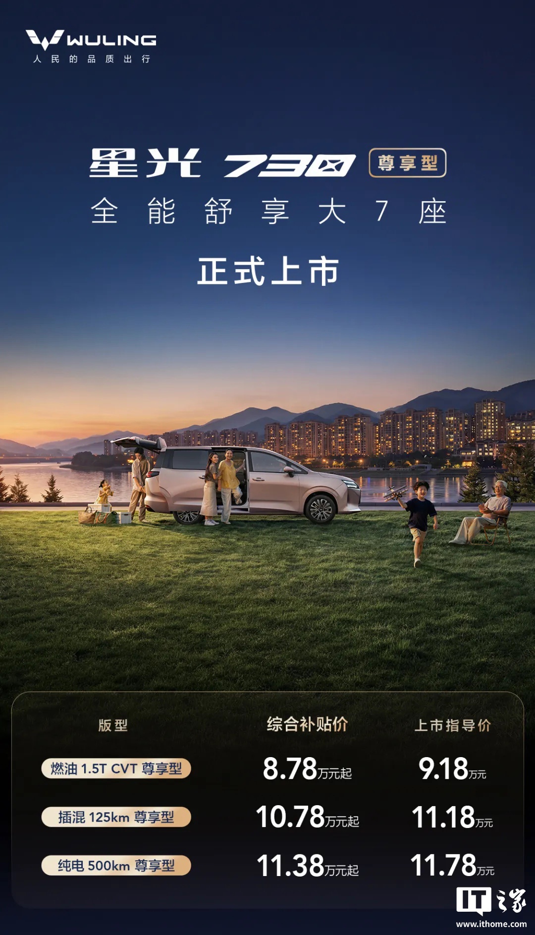 4月28日,五菱汽车宣布星光730尊享型正式上市,综合补贴后的价格分别为燃油1.5TCVT尊享型8.78万元、插混125km尊享型10.78万元以及纯电500km尊享型11.38万元。新车的尺寸为4910×1850×1770mm,轴距2910mm,外观设计延续了现款车型的风格。配置上,星光730尊享型标配右侧电动滑移门与智能电动尾门,座舱内搭载灵语AI中枢智能体与灵眸智能辅助驾驶系统,语音交互体验得到优化,并配备智慧恒温自动空调、自动大灯及感应雨刮等自动化配置。