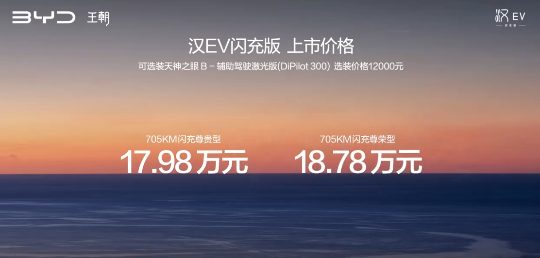 4月28日,比亚迪汉EV闪充版正式发布,起售价为17.98万元,提供1.2万元选装天神之眼B辅助驾驶激光版。新车延续“龙颜美学”设计理念,支持5款配色及多种官方改色车衣,车身尺寸与在售车型一致,长宽高分别为4995毫米、1910毫米、1495毫米,轴距2920毫米。