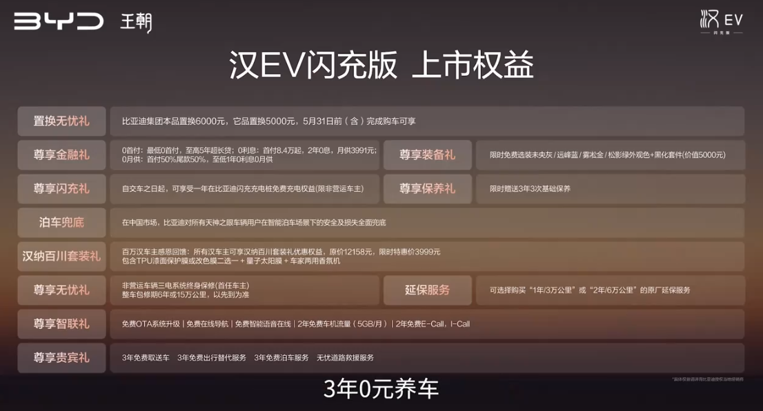电池及闪充技术,配备69.07千瓦时电池组,CLTC工况下续航里程达705公里。闪充技术实现“5分钟充好、9分钟充饱、零下30度只多3分钟”的充电体验。百公里电耗10.8度,宣称为“全球最低能耗的C级轿车”。此外,汉EV闪充版搭载“天神之眼”5.0辅助驾驶系统,基于“强化学习”的端到端大模型,支持智能泊车。新车还新增后排座椅通风加热功能。