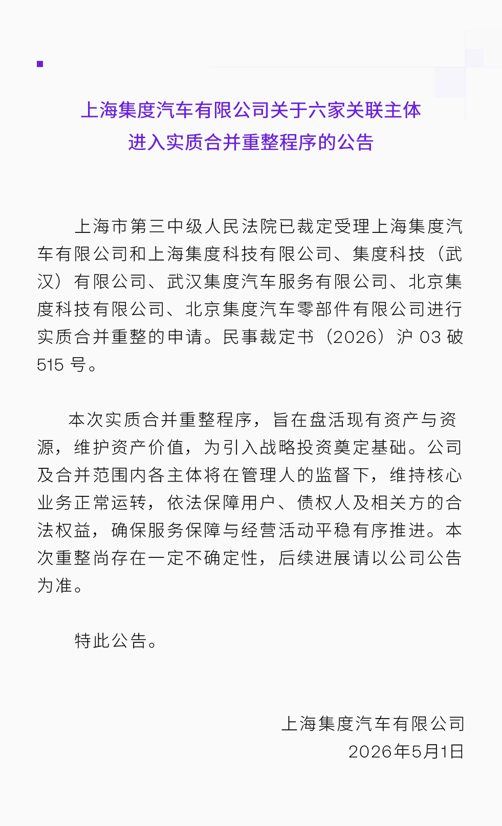 今日,上海集度汽车有限公司发布公告,宣布六家关联主体已进入实质合并重整程序。上海市第三中级人民法院已裁定受理上海集度汽车有限公司及其五家关联公司的合并重整申请,旨在通过盘活资产与资源,维护资产价值,并为引入战略投资奠定基础。根据公告,公司及合并范围内各主体将在管理人的监督下维持核心业务正常运转,并依法保障用户、债权人及相关方的合法权益,确保服务保障与经营活动平稳有序推进。