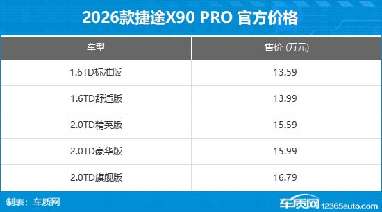 今日,我们从捷途汽车官方获悉,旗下2026款捷途X90 PRO正式上市,共推出5款车型,售价区间为13.59-16.79万元。同时,官方还推出了上市权益,包括15000元超级置换补贴、首任非营运车主享整车终身质保、首任车主享5年免费流量(6G/月)等。