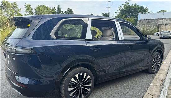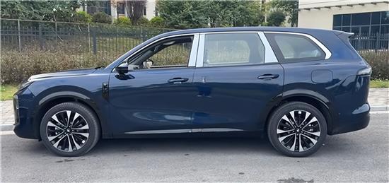车侧部分,该车采用传统SUV造型设计,翼子板上设有摄像头模组,门把手则为传统样式。尺寸部分,该车尺寸为5235mm*1999mm*1800mm,轴距3105mm,看齐理想L9、问界M9等大型SUV。