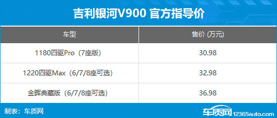1月20日,吉利银河V900正式上市,共推出3款车型,上市指导价30.98-36.98万元,上市限时指导价26.98-32.98万元。此外,现在下订即享焕新礼、购置礼、红包礼、金融礼、智行礼、质保礼、交付礼、流量礼、跃阶礼九重购车好礼。