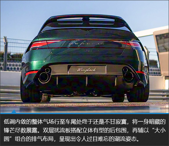 捷尼赛思G90 Wingback在外观设计方面实现了品牌经典元素、旅行车特质以及性能感的有机融合。短前悬、长轴距与长后悬的黄金比例组合,搭配由B柱向后自然延伸并流畅下滑的车顶线条,勾勒出十分优雅的整体轮廓,极具视觉张力。另外值得一提的是,作为一款概念车,其所有设计元素都非常“接地气”,量产难度几乎可以忽略不计。