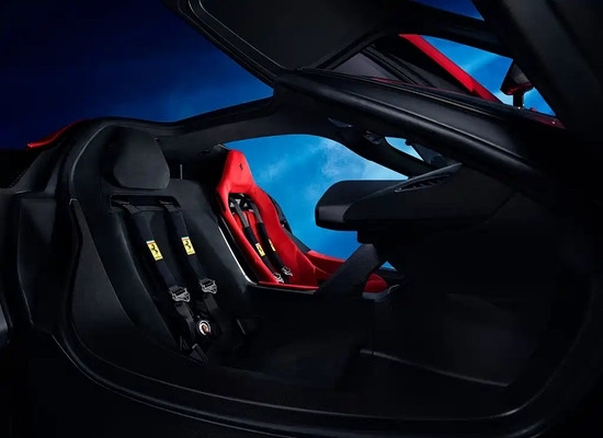 车身结构上,法拉利F80的车顶采用全碳纤维材质打造,前后副车架则使用铝制结构,在保证刚性的同时兼顾轻量化需求。座舱采用双座布局,中控台整体向驾驶员一侧倾斜,突出驾驶导向的设计理念,并配备法拉利专为该车开发的全新方向盘。