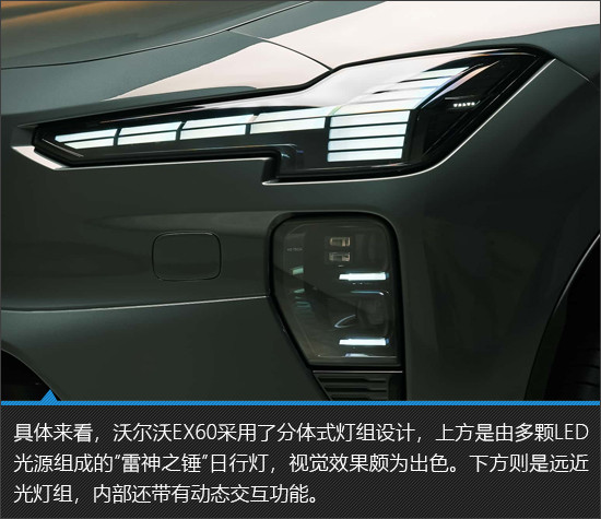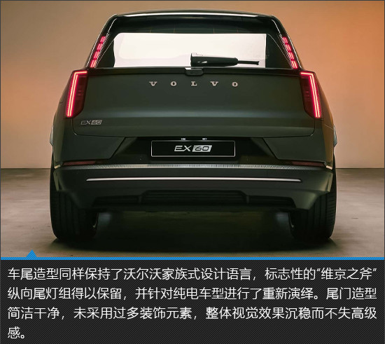 沃尔沃EX60在外观设计上延续了品牌标志性的北欧简约风格,同时通过封闭式前格栅等电动化设计元素,强化了其纯电车型身份。整车造型稳重而不失科技感,既符合沃尔沃一贯的家族审美,也满足当下消费者对新能源车型设计的主流期待。