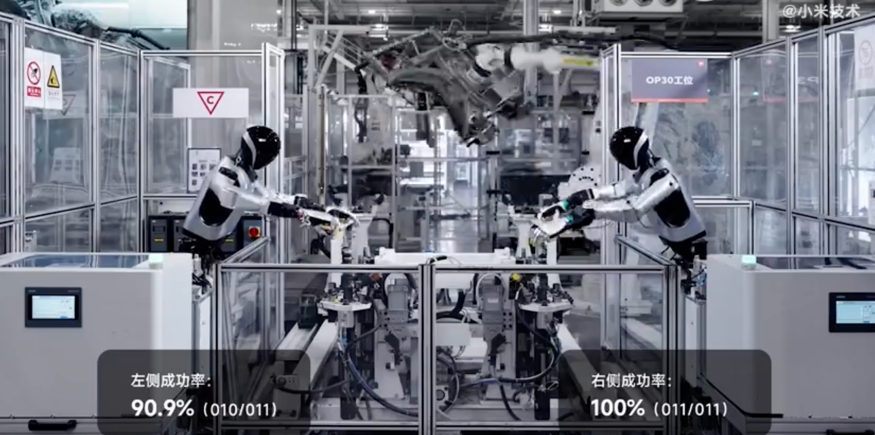 近日,雷军在微博透露,小米机器人已经进入汽车工厂工作,展示了自主安装螺丝、搬运料箱及安装车标等多项能力。在真实环境中,它能连续运行3小时,安装成功率达90.2%,最快76秒完成生产节拍要求。