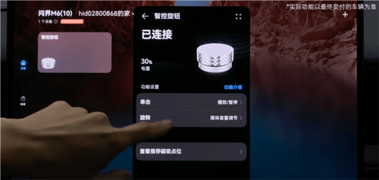 官方提供的磁吸旋钮采用类似金属的质感,支持旋转和点按,用户可在车载中控屏里自行选择相对应的功能,包括多个位置的音量调节、空调温度调节、遮阳帘开闭等,还支持场景自定义,设置场景后,上车只需摁一下就能一键直达,方便快捷。