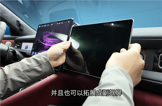 不止如此,它还能作为光影香氛使用,与车内氛围灯联动,且支持连接电子设备支架模块,挂载平板,让副驾驶也有娱乐屏。