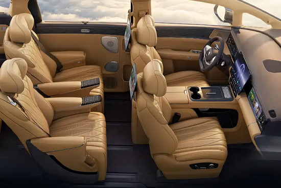 内饰方面,新款腾势D9相较现款车型进行了多处升级。中控台整体布局经过重新调整,线条更加横平竖直,视觉层次更为规整。空调出风口、副驾娱乐屏、全新电子怀挡以及物理按键布局均有所变化,使中控区域看起来更加清晰利落,整体内饰风格也更为清爽简洁。此外,新车在保留第二排靠背屏幕的基础上新增吸顶屏,并对座椅配置进行了进一步升级,以提升后排乘坐体验。